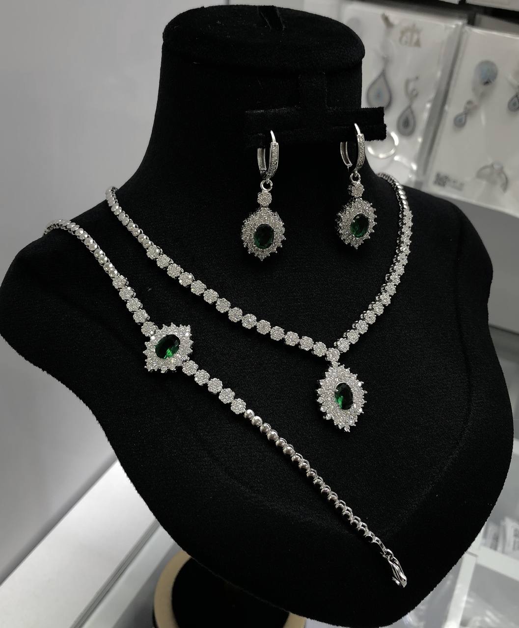این سرویس شامل گردنبند، گوشواره و دستبند با طراحی ظریف و سنگهای درخشان است که در مرکز آن نگینی سبز رنگ و جذاب خودنمایی میکند.