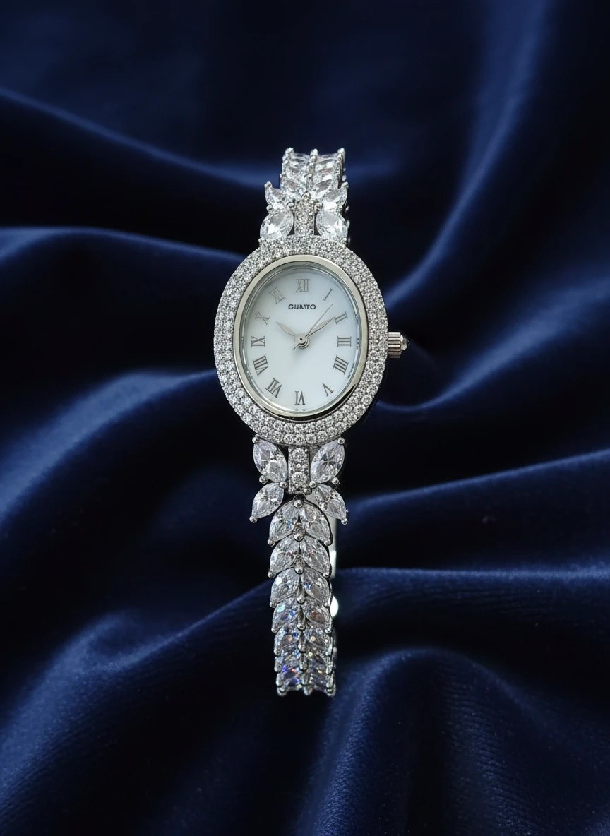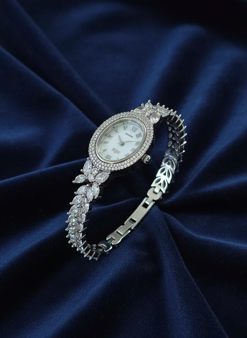 این ساعت با طراحی بیضی ظریف و نگینهای مارکیز درخشان، جلوهای مشابه جواهرات طلا سفید ایجاد کرده و با آبکاری درجه یک رودیوم در برابر تغییر رنگ کاملاً مقاوم است.