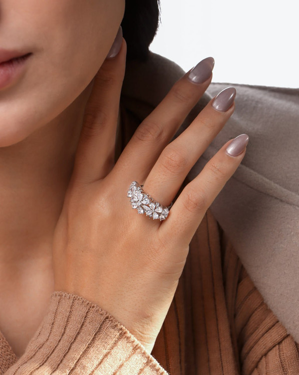 اگر بهدنبال یک انگشتر لوکس، درخشان و خاص هستید که ظاهری کاملاً مشابه طلا سفید داشته باشد، این انگشتر جواهری نقره ۹۲۵ عیار با نگینهای مارکیز بهترین انتخاب برای شماست. طراحی ظریف و چیدمان هنرمندانهی نگینهای مارکیز، جلوهای فوقالعاده چشمگیر و مجلسی به این انگشتر بخشیده است.