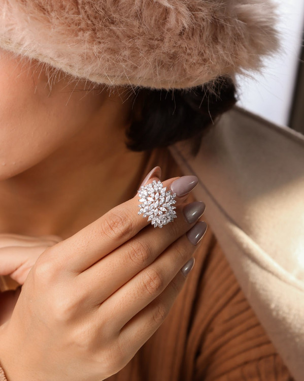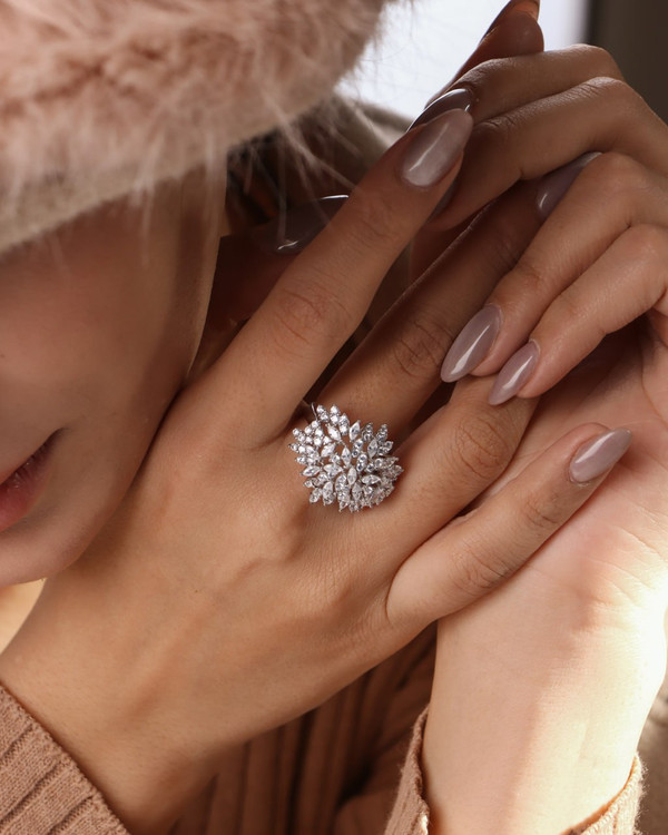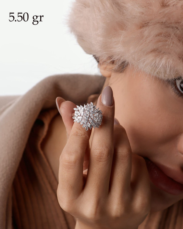 اگر بهدنبال یک انگشتر لوکس، درخشان و خاص هستید که ظاهری کاملاً مشابه طلا سفید داشته باشد، این انگشتر جواهری نقره ۹۲۵ عیار با نگینهای مارکیز بهترین انتخاب برای شماست. طراحی ظریف و چیدمان هنرمندانهی نگینهای مارکیز، جلوهای فوقالعاده چشمگیر و مجلسی به این انگشتر بخشیده است.