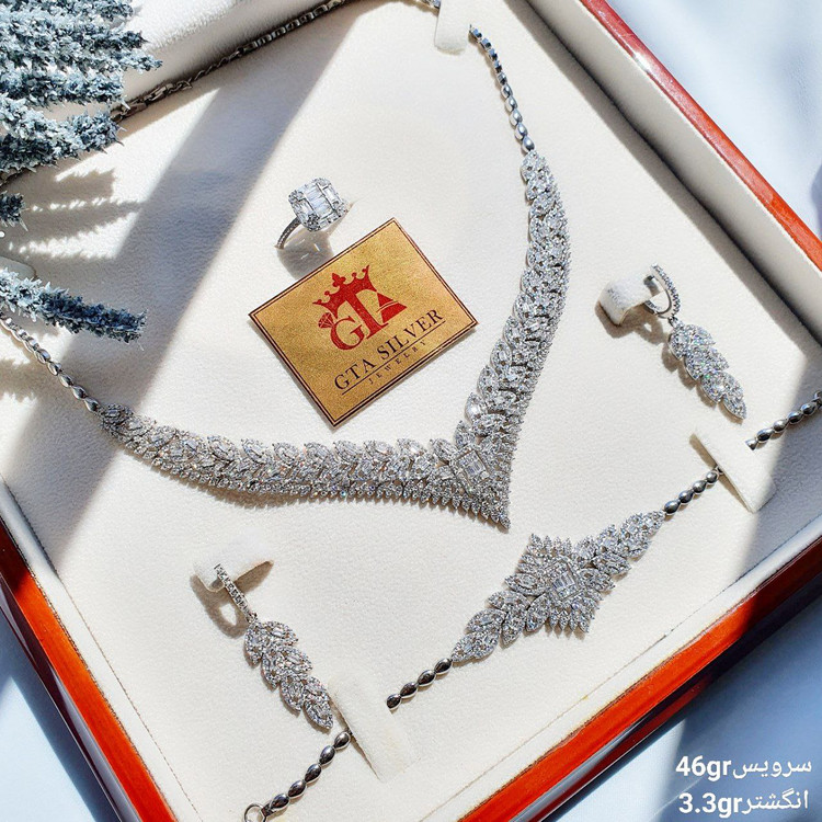 اگر به دنبال یک سرویس جواهر نقره لوکس با طراحی شبیه طلای سفید و کیفیتی کمنظیر هستید، این ست سرویس و انگشتر برند GTA انتخابی بیرقیب برای شماست.