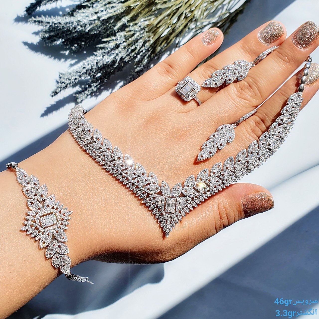 این مجموعه زیبا از نقره اصل ۹۲۵ عیار ساخته شده و با آبکاری درجه یک رودیوم پوشش داده شده تا درخشش فوقالعاده، رنگ ثابت و مقاومت بالا در برابر تیرگی داشته باشد. نگینهای درخشان زیرکونیا اتمی به کار رفته در این سرویس، جلوهای مشابه برلیان ایجاد کرده و آن را به گزینهای عالی برای مجالس رسمی، عروس و هدیهای ماندگار تبدیل کرده است.