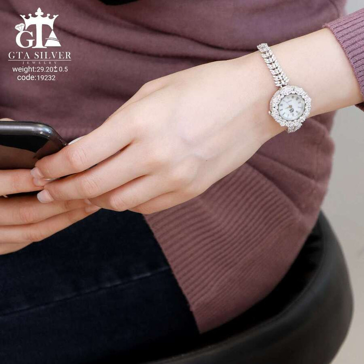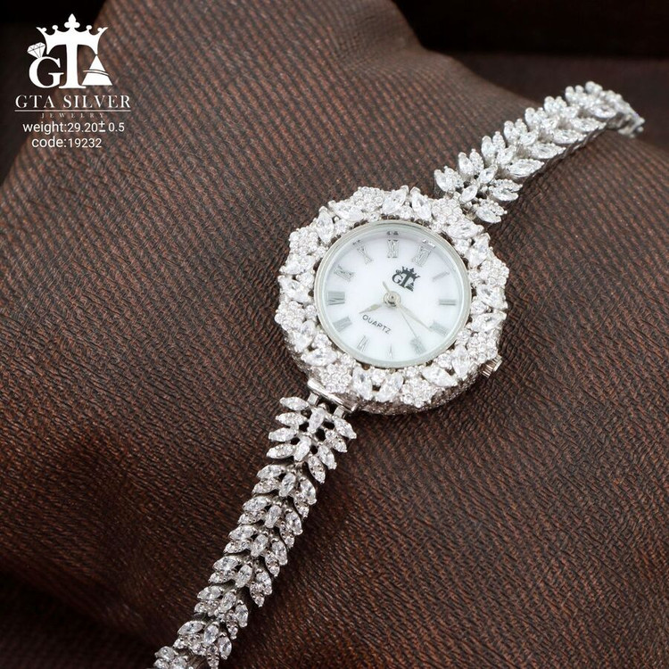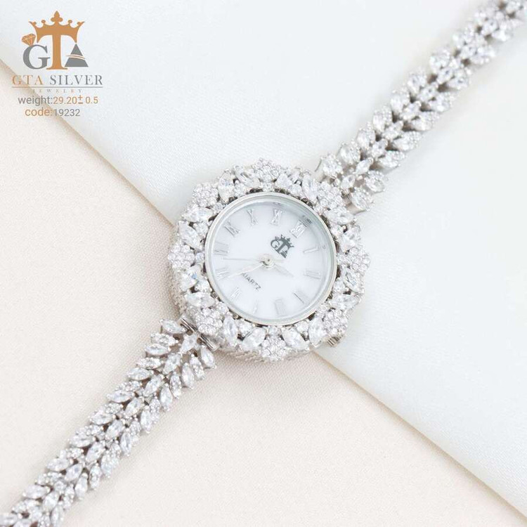 ساعت جواهری رودیوم با نگین های برلیان و مارکیز, کاری بسیار ظریف و زیبا همراه با روکش آب طلای سفید می باشد. عیار این کار همانند تمامی کار های موجود عیار استاندارد 925 می باشد.