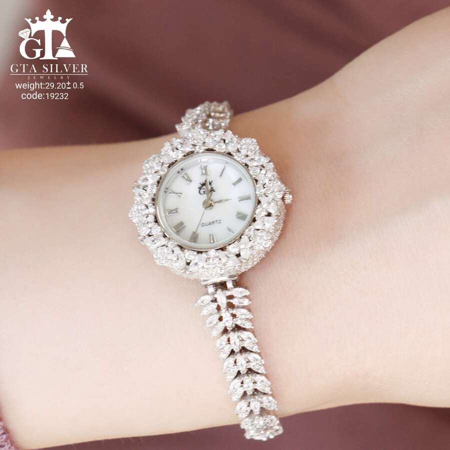 ساعت جواهری رودیوم با نگین های برلیان و مارکیز, کاری بسیار ظریف و زیبا همراه با روکش آب طلای سفید می باشد. عیار این کار همانند تمامی کار های موجود عیار استاندارد 925 می باشد.