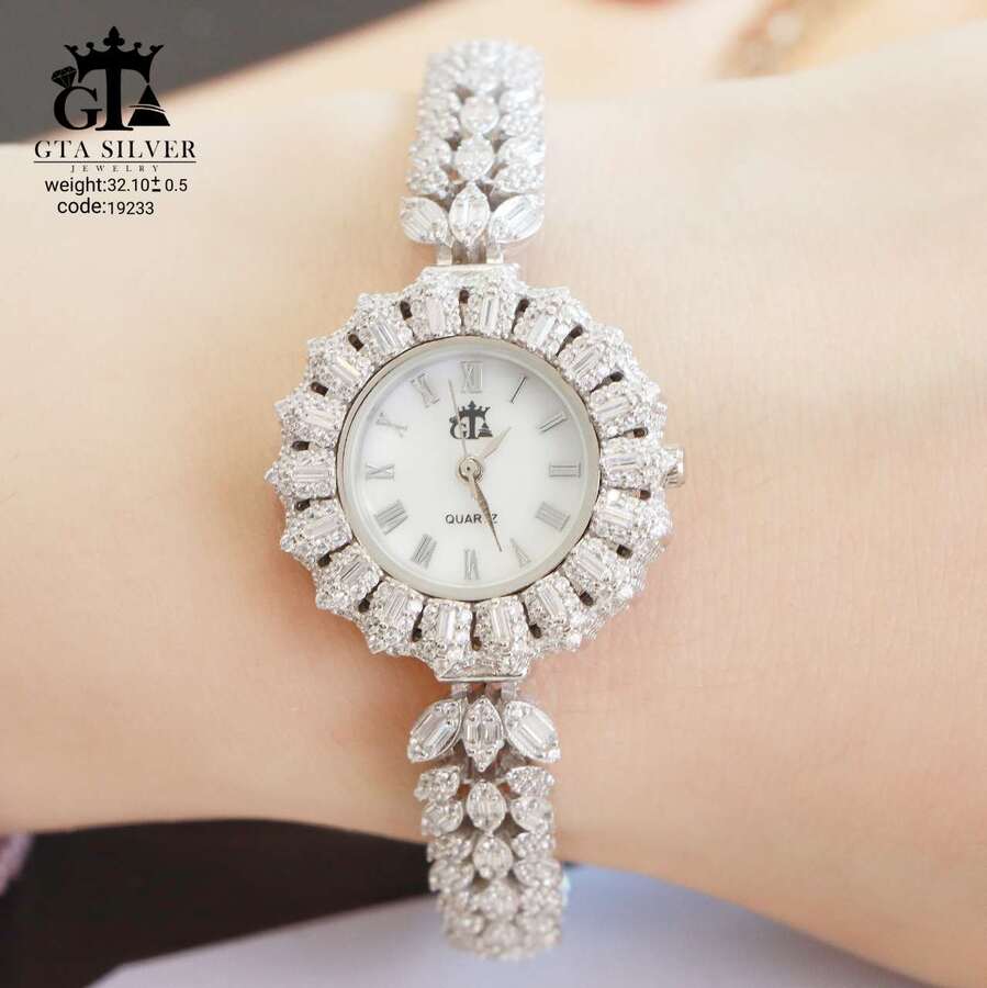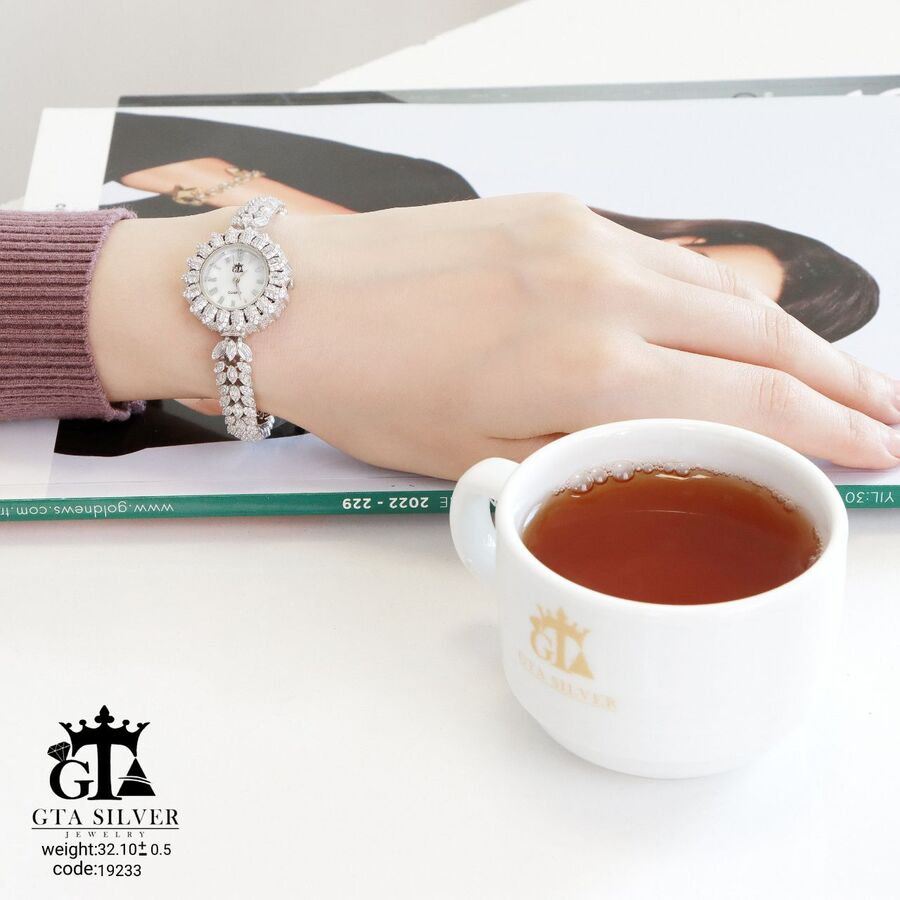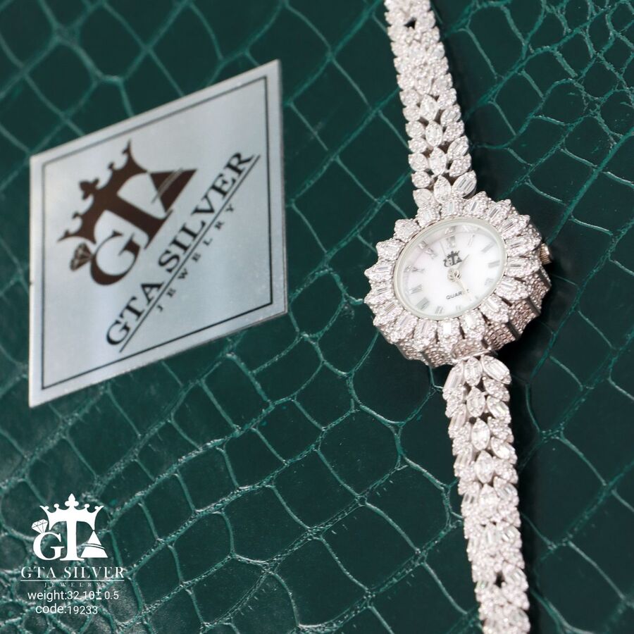 ساعت جواهری رودیوم با نگین های برلیان, باگت و تیپرز, کاری بسیار ظریف و زیبا همراه با روکش آب طلای سفید می باشد. عیار این کار همانند تمامی کار های موجود عیار استاندارد 925 می باشد.