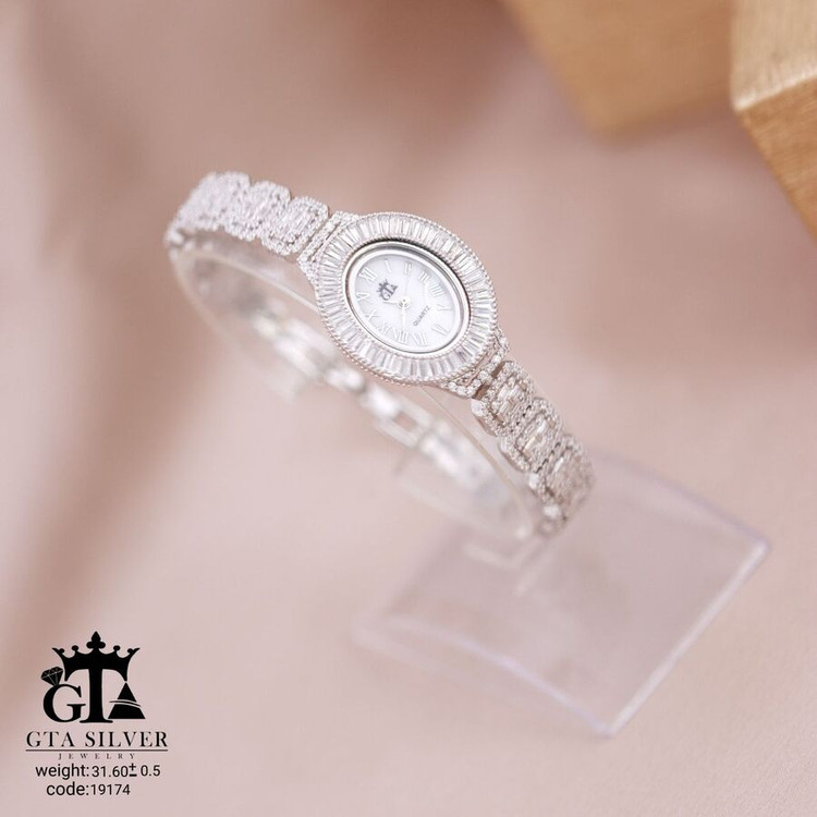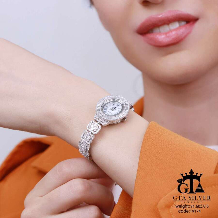 ساعت جواهری رودیوم با نگین های برلیان, کاری بسیار ظریف و زیبا همراه با روکش آب طلای سفید می باشد. عیار این کار همانند تمامی کار های موجود عیار استاندارد 925 می باشد.