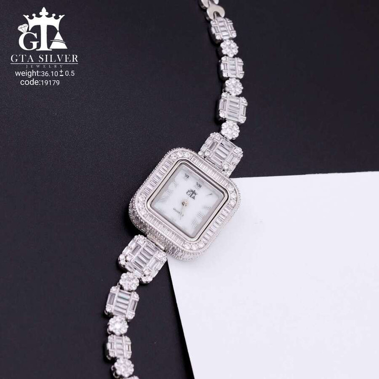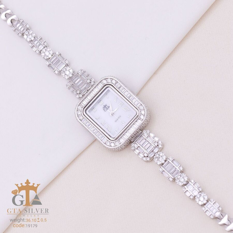ساعت جواهری رودیوم با نگین های برلیان, کاری بسیار ظریف و زیبا همراه با روکش آب طلای سفید می باشد. عیار این کار همانند تمامی کار های موجود عیار استاندارد 925 می باشد.
