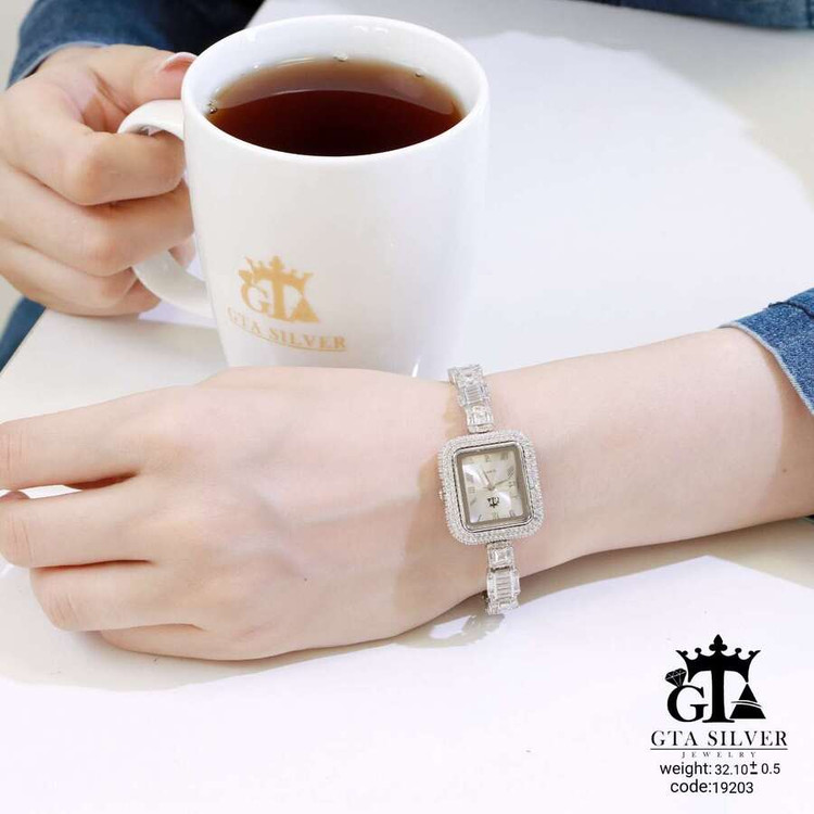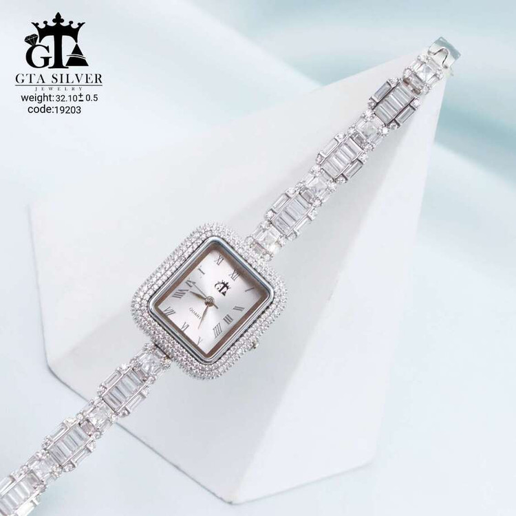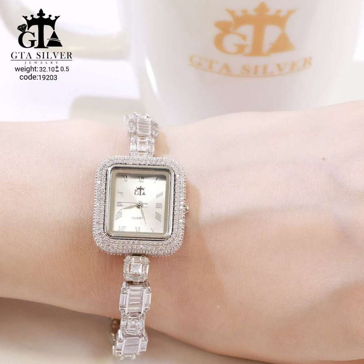 ساعت جواهری رودیوم مارک GTA طرح امرالدکات با نگین های برلیان و یاگت, کاری بسیار ظریف و زیبا همراه با روکش آب طلای سفید می باشد. عیار این کار همانند تمامی کار های موجود عیار استاندارد 925 می باشد.