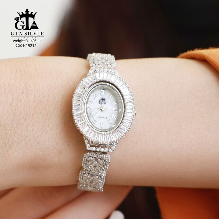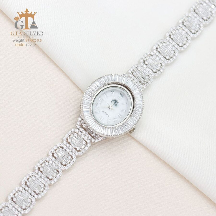 ساعت جواهری رودیوم با نگین های برلیان و باگت, کاری بسیار ظریف و زیبا همراه با روکش آب طلای سفید می باشد. عیار این کار همانند تمامی کار های موجود عیار استاندارد 925 می باشد.