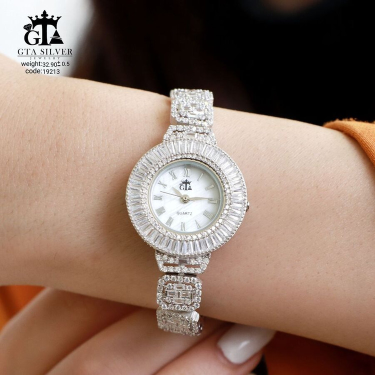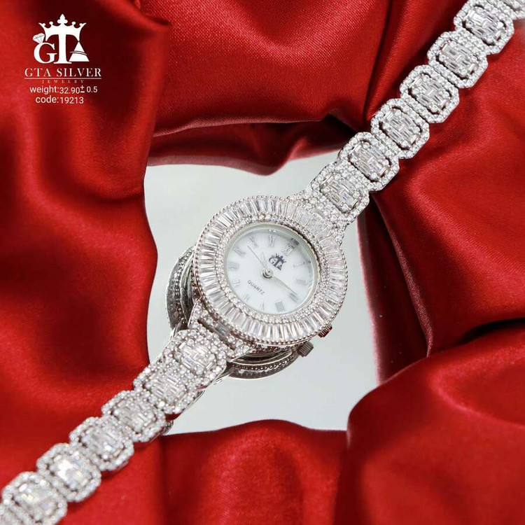 ساعت جواهری رودیوم مارک GTA با نگین های برلیان, باگت و تیپرز, کاری بسیار ظریف و زیبا همراه با روکش آب طلای سفید می باشد. عیار این کار همانند تمامی کار های موجود عیار استاندارد 925 می باشد.