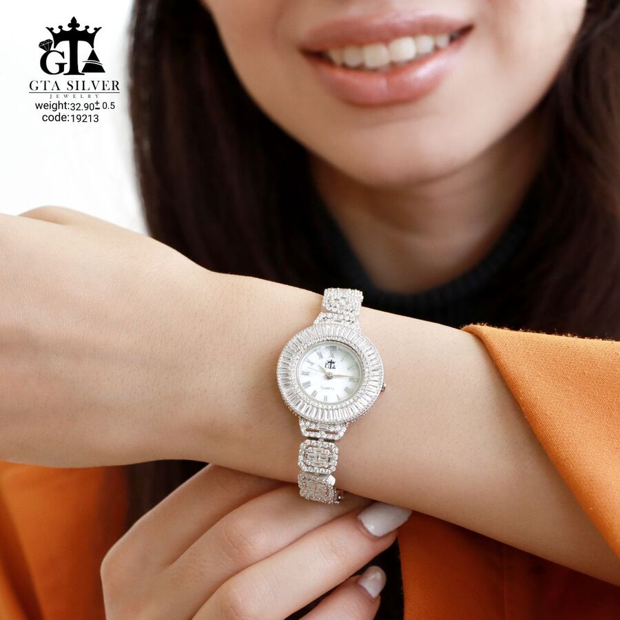 ساعت جواهری رودیوم مارک GTA با نگین های برلیان, باگت و تیپرز, کاری بسیار ظریف و زیبا همراه با روکش آب طلای سفید می باشد. عیار این کار همانند تمامی کار های موجود عیار استاندارد 925 می باشد.