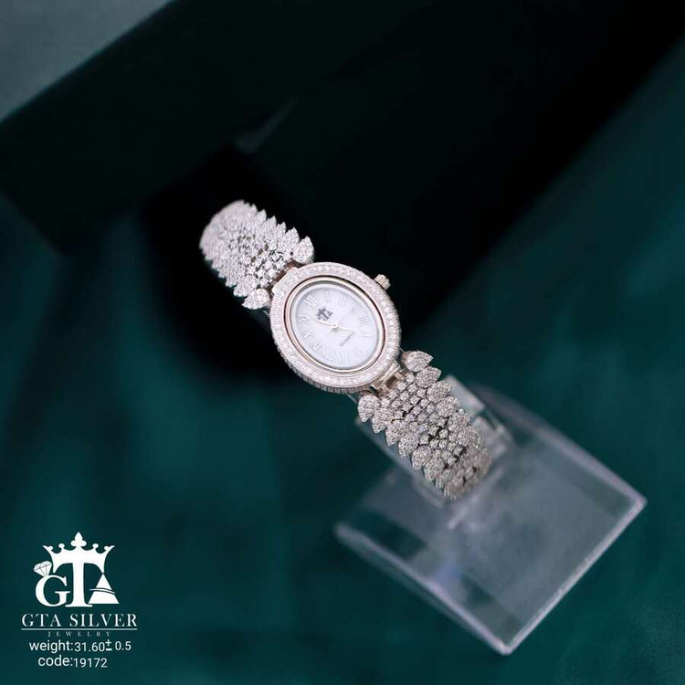 ساعت جواهری رودیوم با نگین های برلیان, کاری بسیار ظریف و زیبا همراه با روکش آب طلای سفید می باشد. عیار این کار همانند تمامی کار های موجود عیار استاندارد 925 می باشد.