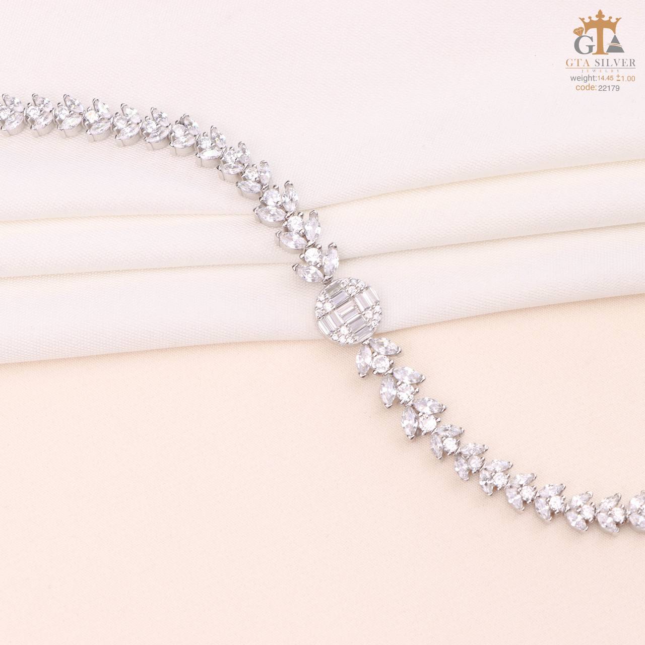 دستبندی بینظیر از نقرهی ناب ۹۲۵ عیار که با طراحی شاهانه و نگینکاری دقیق، چشم هر بینندهای را به خود خیره میکند.