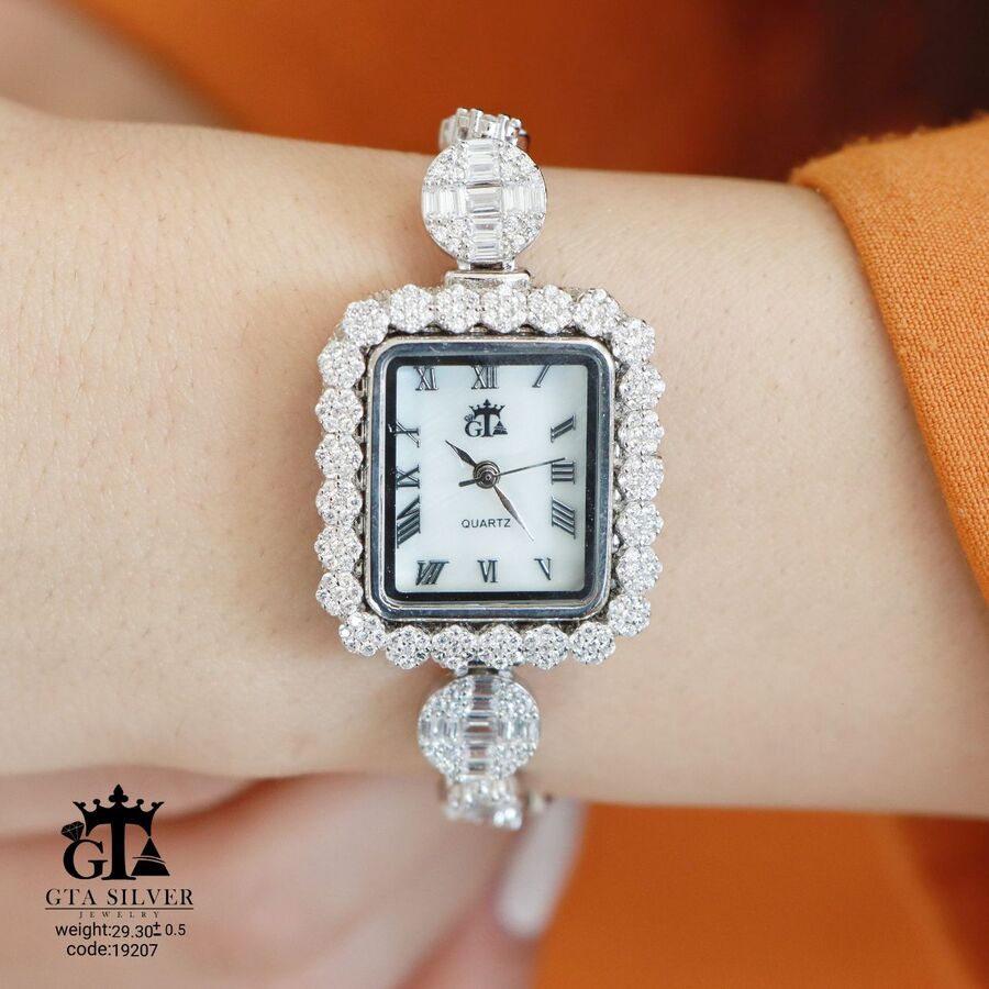 ساعت جواهری رودیوم با نگین های برلیان, موتور میوتای ژاپن کیفیت درجه 1 کاری بسیار ظریف و زیبا همراه با روکش آب طلای سفید می باشد.
