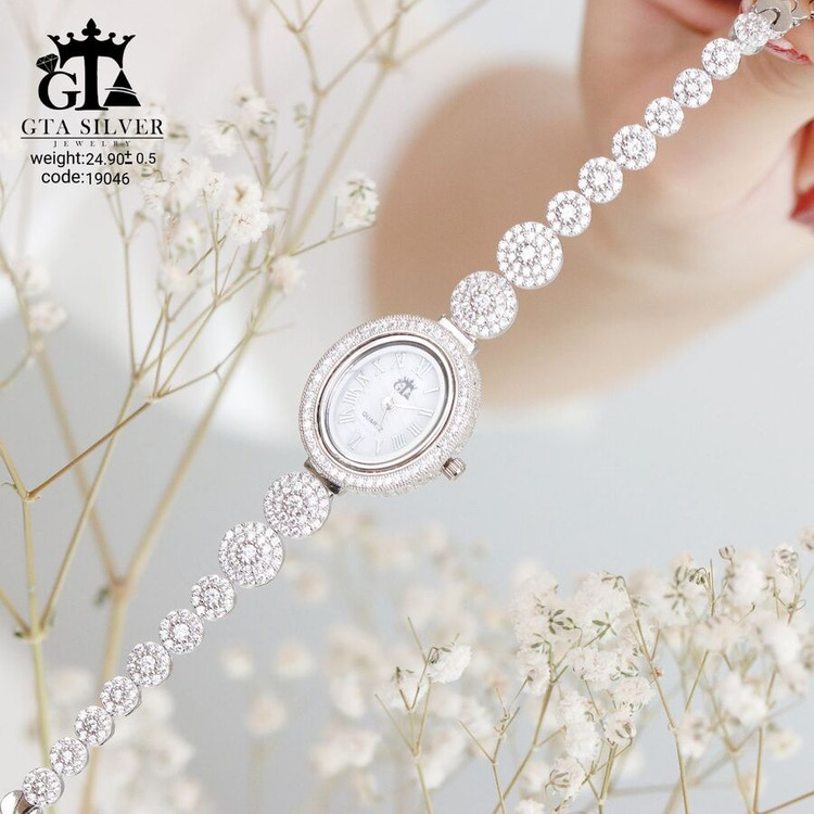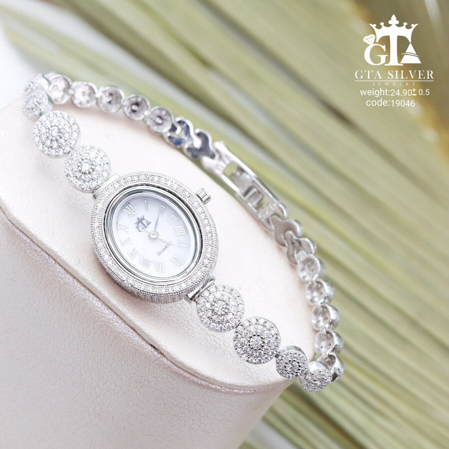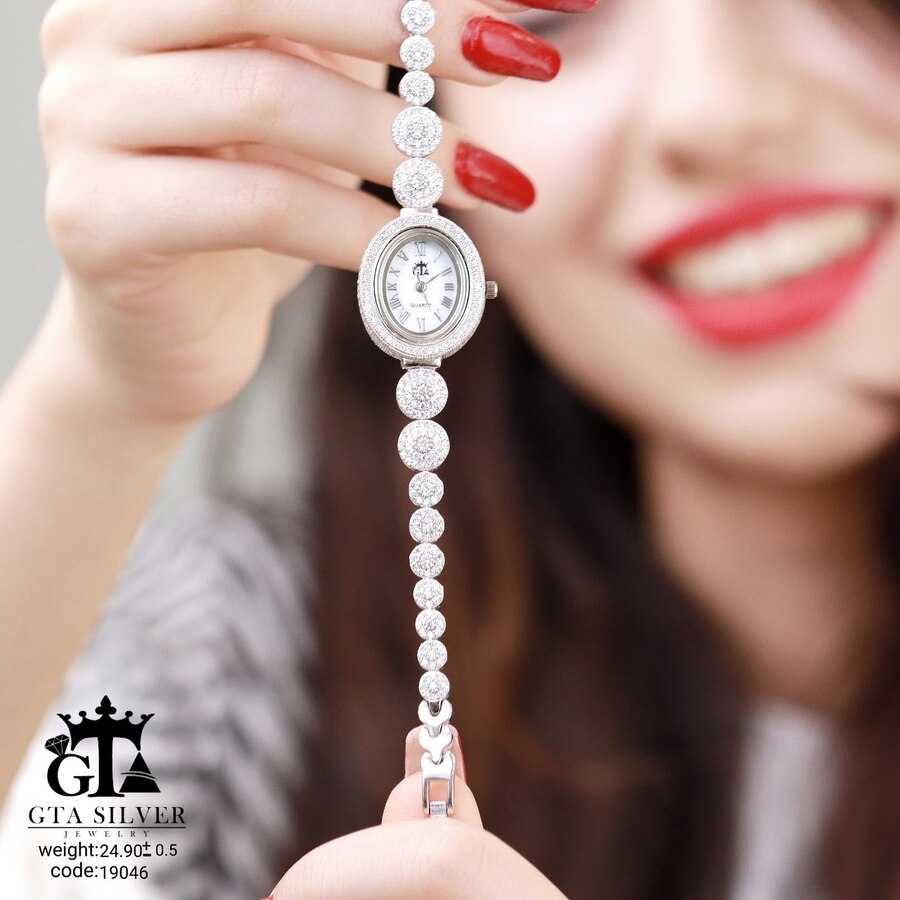 ساعت جواهری رودیوم با نگین های برلیان, کاری بسیار ظریف و زیبا همراه با روکش آب طلای سفید می باشد. عیار این کار همانند تمامی کار های موجود عیار استاندارد 925 می باشد.