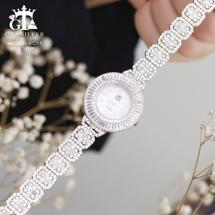 ساعت جواهری رودیوم مارک جیتیا (GTA) طرح امرالدکات با نگین های برلیان و باگت, کاری بسیار ظریف و زیبا همراه با روکش آب طلای سفید می باشد. عیار این کار همانند تمامی کار های موجود عیار استاندارد 925 می باشد.