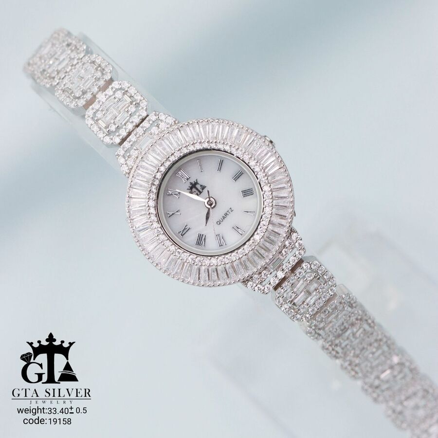 ساعت جواهری رودیوم مارک جیتیا (GTA) طرح امرالدکات با نگین های برلیان و باگت, کاری بسیار ظریف و زیبا همراه با روکش آب طلای سفید می باشد. عیار این کار همانند تمامی کار های موجود عیار استاندارد 925 می باشد.