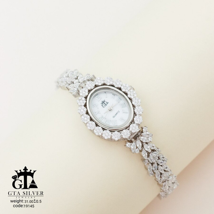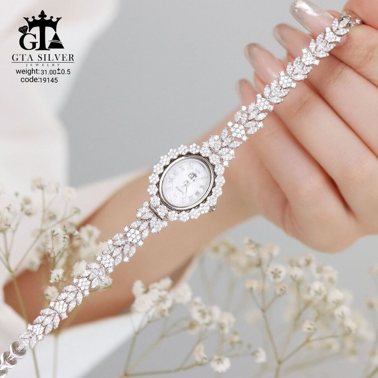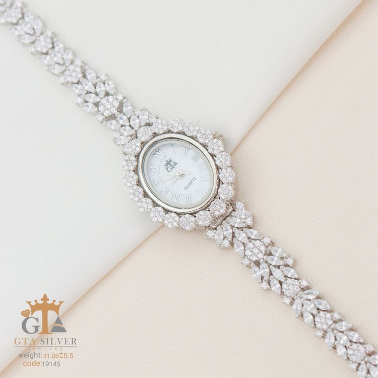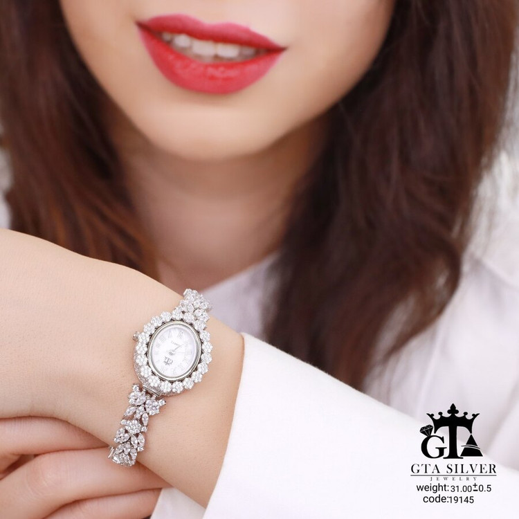 ساعت جواهری رودیوم با نگین های برلیان, کاری بسیار ظریف و زیبا همراه با روکش آب طلای سفید می باشد. عیار این کار همانند تمامی کار های موجود عیار استاندارد 925 می باشد.