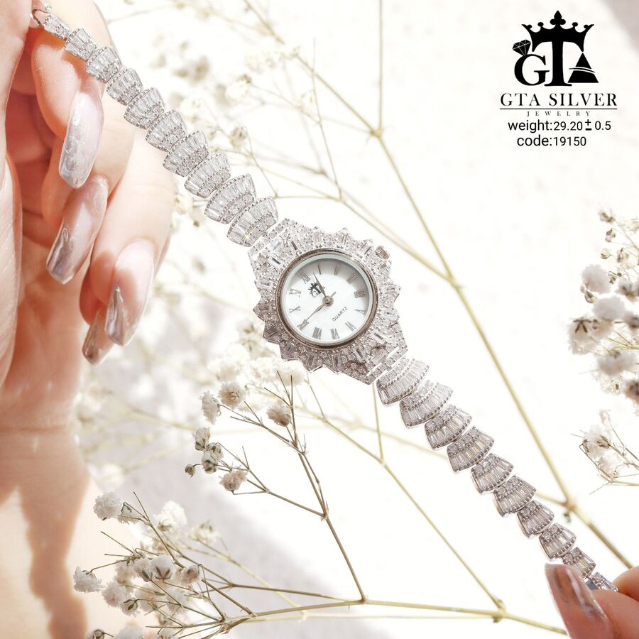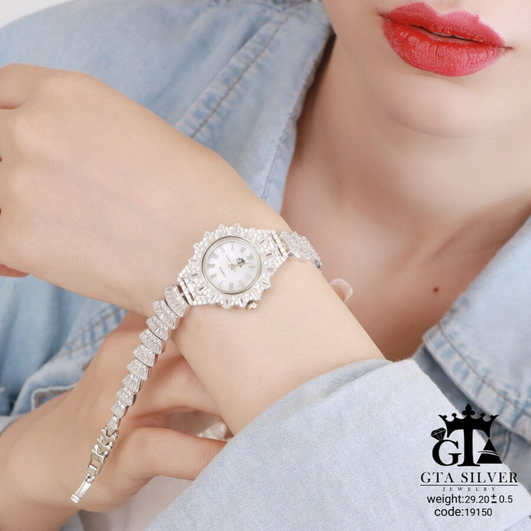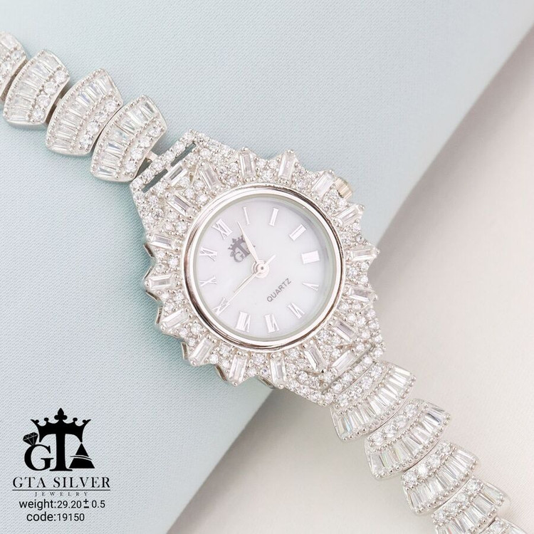 ساعت جواهری رودیوم با نگین های برلیان, کاری بسیار ظریف و زیبا همراه با روکش آب طلای سفید می باشد. عیار این کار همانند تمامی کار های موجود عیار استاندارد 925 می باشد.