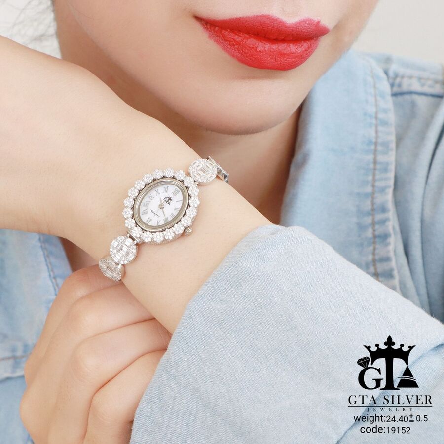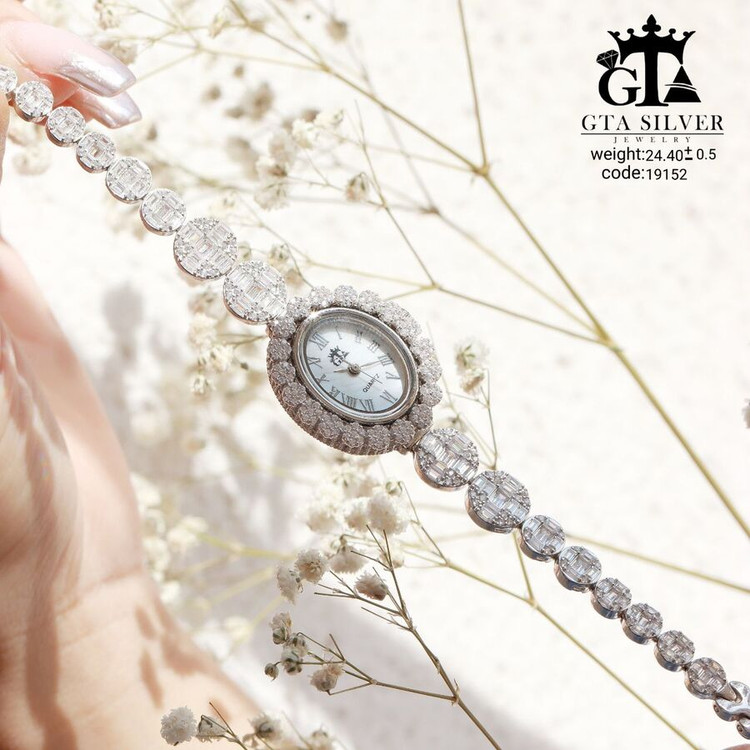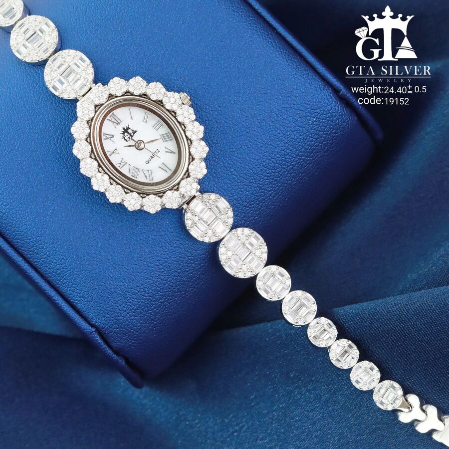 ساعت جواهری رودیوم با نگین های برلیان, کاری بسیار ظریف و زیبا همراه با روکش آب طلای سفید می باشد. عیار این کار همانند تمامی کار های موجود عیار استاندارد 925 می باشد.