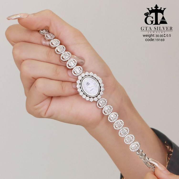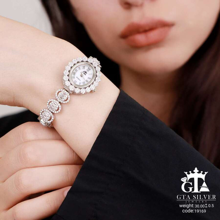 ساعت جواهری رودیوم با نگین های برلیان, کاری بسیار ظریف و زیبا همراه با روکش آب طلای سفید می باشد. عیار این کار همانند تمامی کار های موجود عیار استاندارد 925 می باشد.