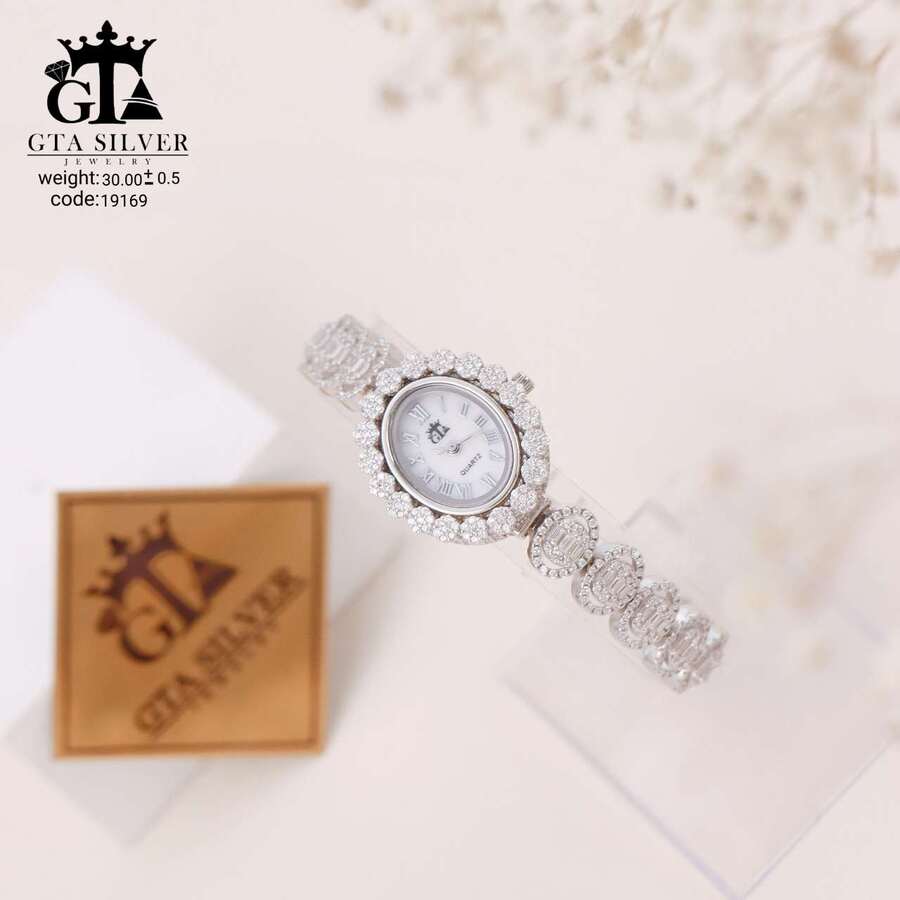 ساعت جواهری رودیوم با نگین های برلیان, کاری بسیار ظریف و زیبا همراه با روکش آب طلای سفید می باشد. عیار این کار همانند تمامی کار های موجود عیار استاندارد 925 می باشد.