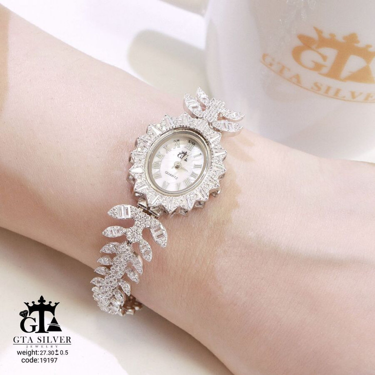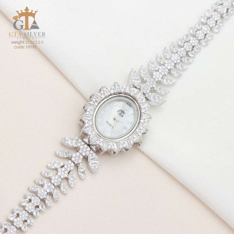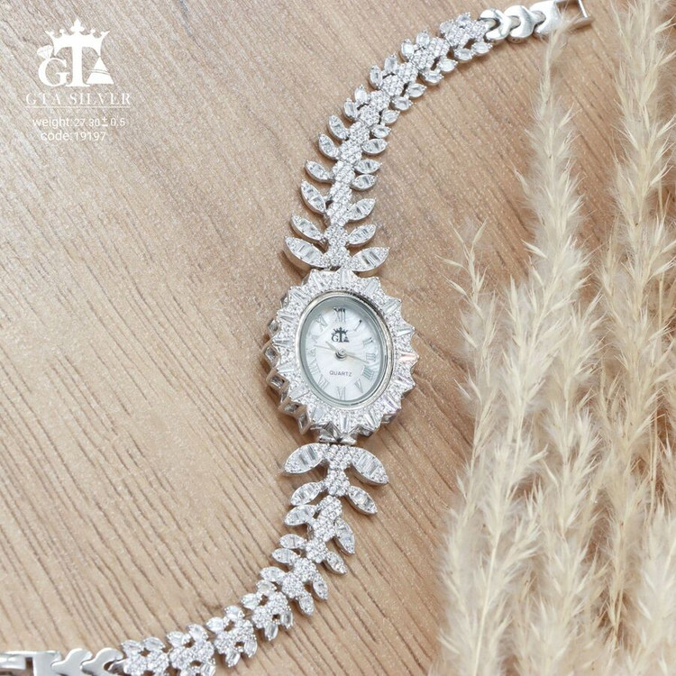 ساعت جواهری رودیوم با نگین های برلیان, باگت و تیپرز, کاری بسیار ظریف و زیبا همراه با روکش آب طلای سفید می باشد. عیار این کار همانند تمامی کار های موجود عیار استاندارد 925 می باشد.