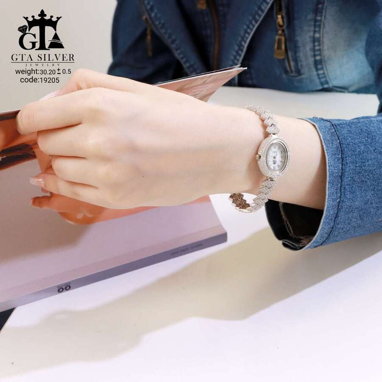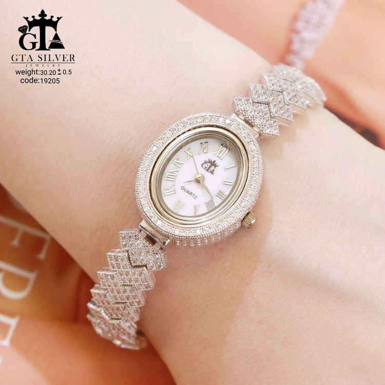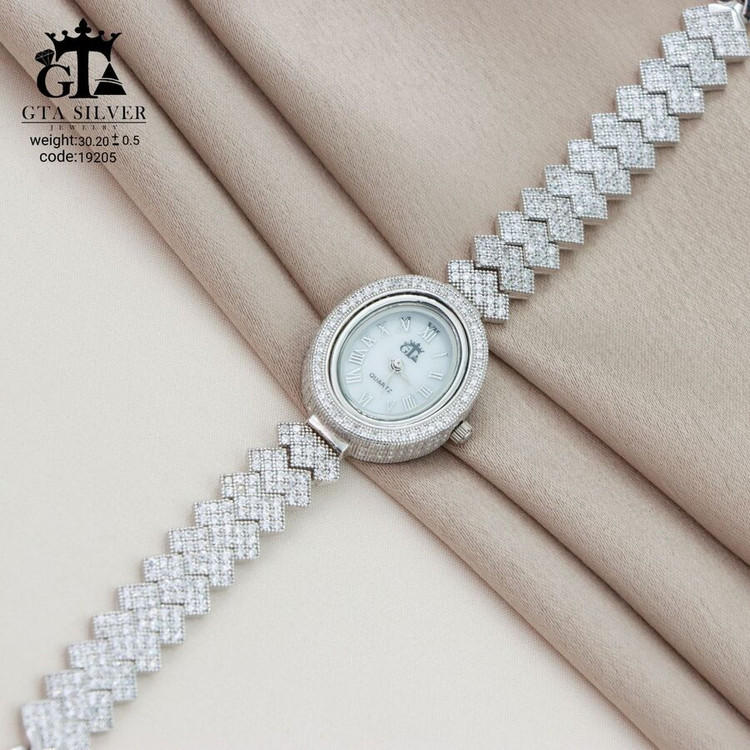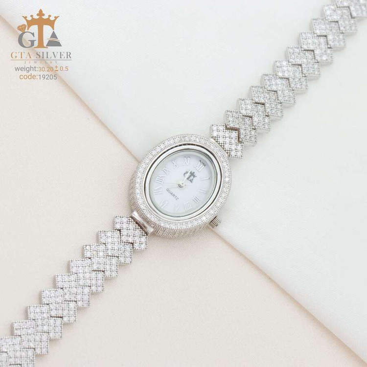 ساعت جواهری رودیوم با نگین های برلیان, کاری بسیار ظریف و زیبا همراه با روکش آب طلای سفید می باشد. عیار این کار همانند تمامی کار های موجود عیار استاندارد 925 می باشد.
