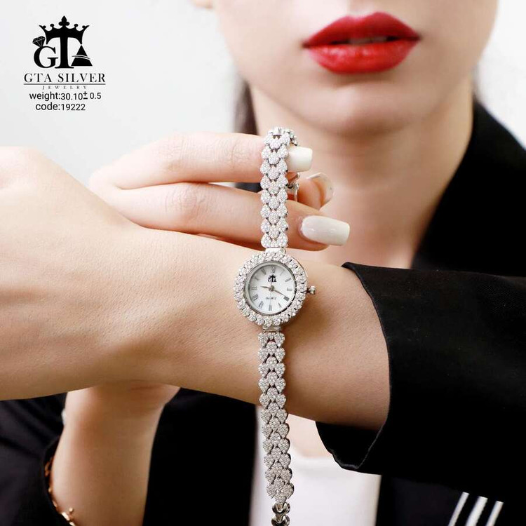 ساعت جواهری رودیوم با نگین های برلیان, کاری بسیار ظریف و زیبا همراه با روکش آب طلای سفید می باشد. عیار این کار همانند تمامی کار های موجود عیار استاندارد 925 می باشد.