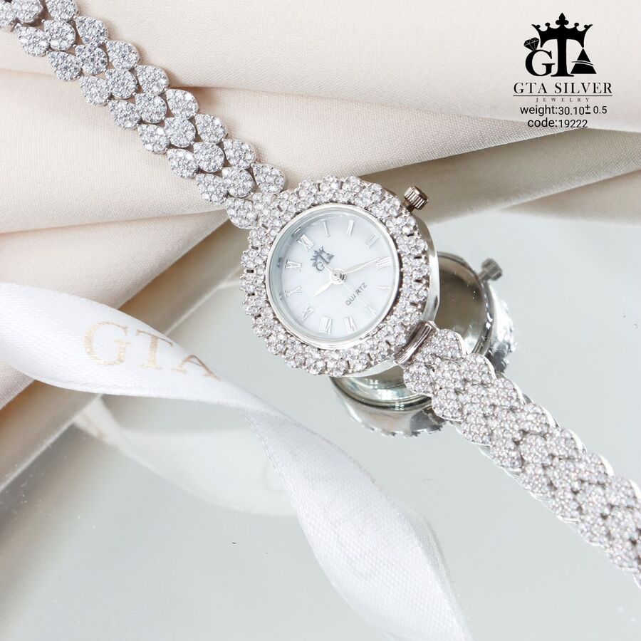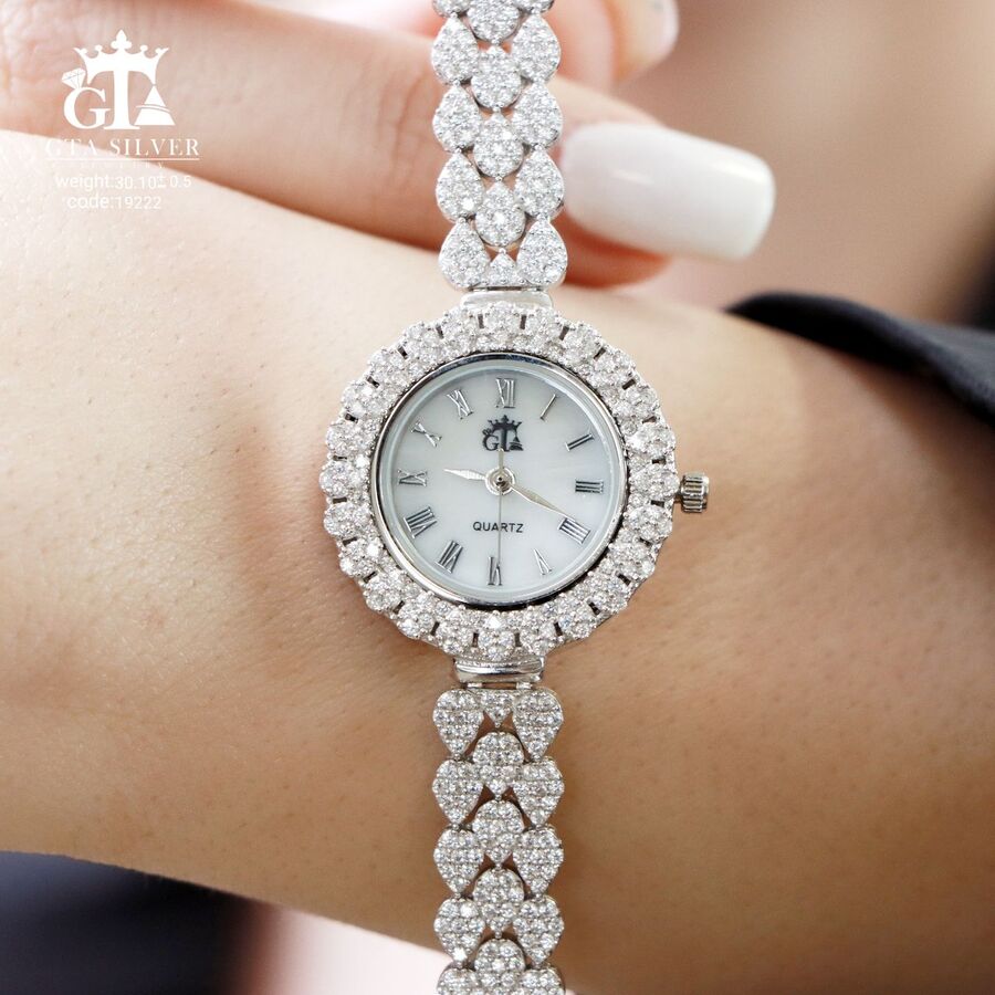 ساعت جواهری رودیوم با نگین های برلیان, کاری بسیار ظریف و زیبا همراه با روکش آب طلای سفید می باشد. عیار این کار همانند تمامی کار های موجود عیار استاندارد 925 می باشد.
