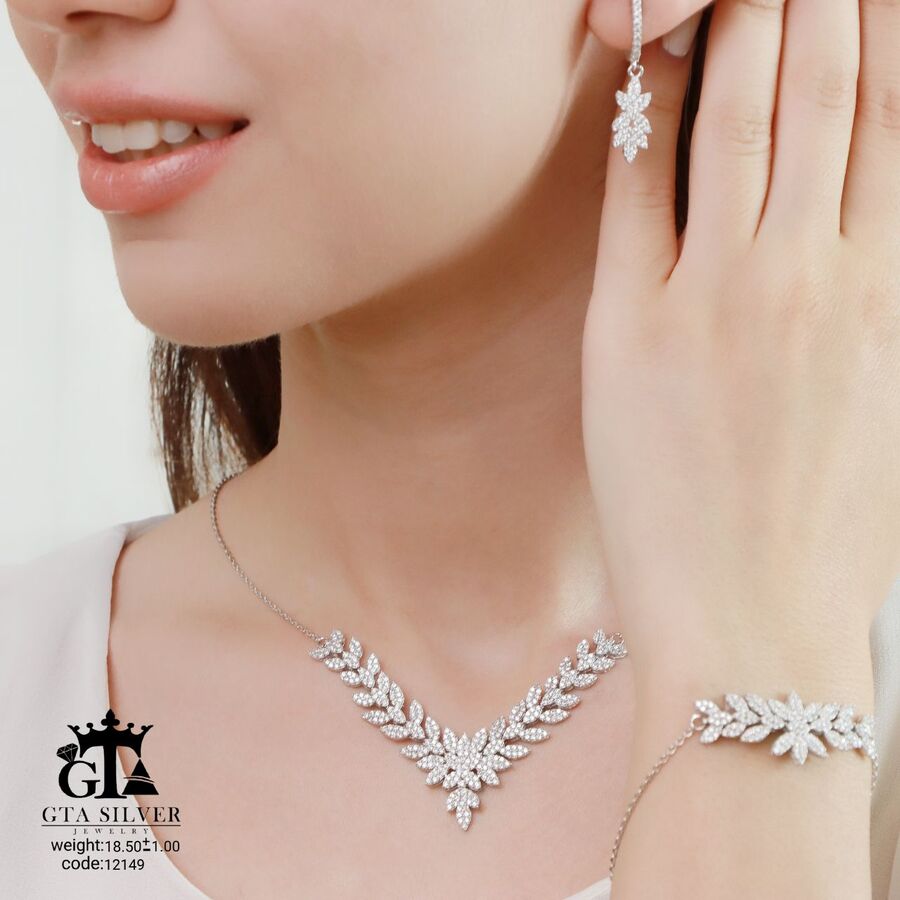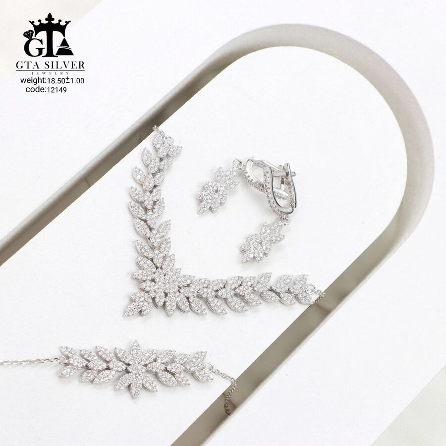 سرویس میکرو زنجیری نقره همراه با روکش آبطلای سفید؛ عیار 925، تمامی نگین های این سرویس جدید و ظریف با روش جدید میکروستینگ مخراج کاری شده است.
