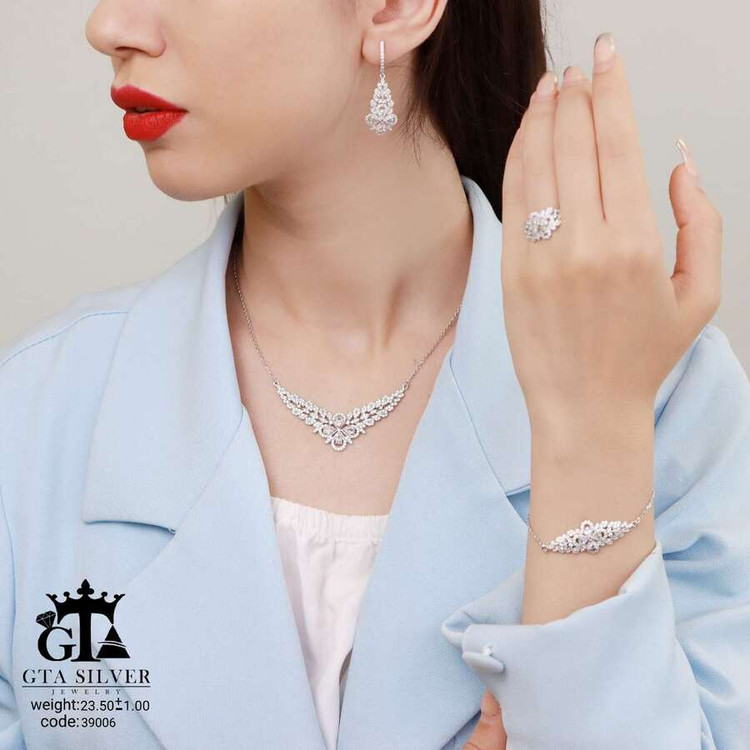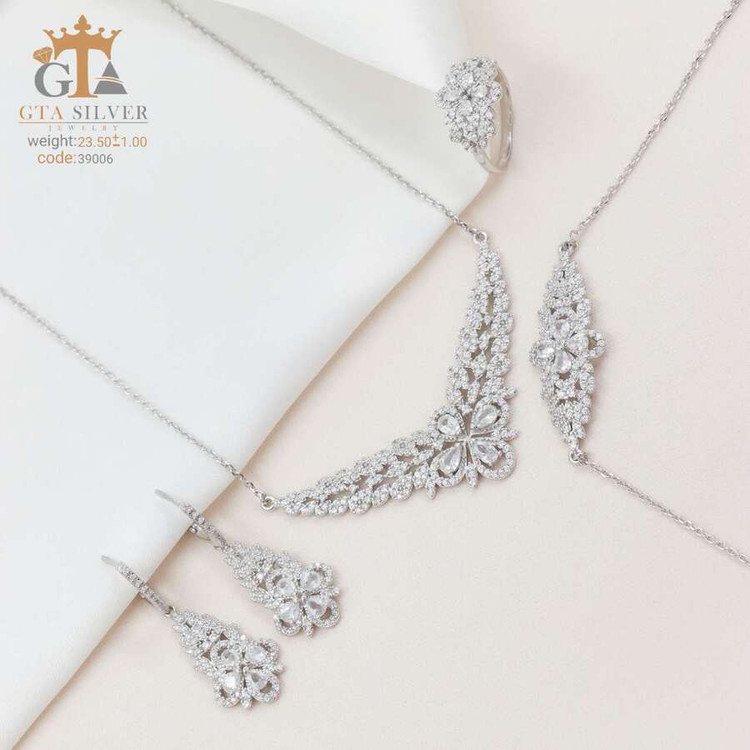 سرویس نقره مدل سوپر میکرو زنجیری همراه با روکش آبطلای سفید؛ عیار 925، تمامی نگین های این سرویس جدید با روش جدید میکروستینگ مخراج کاری شده است.