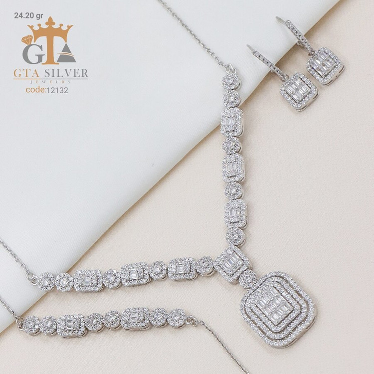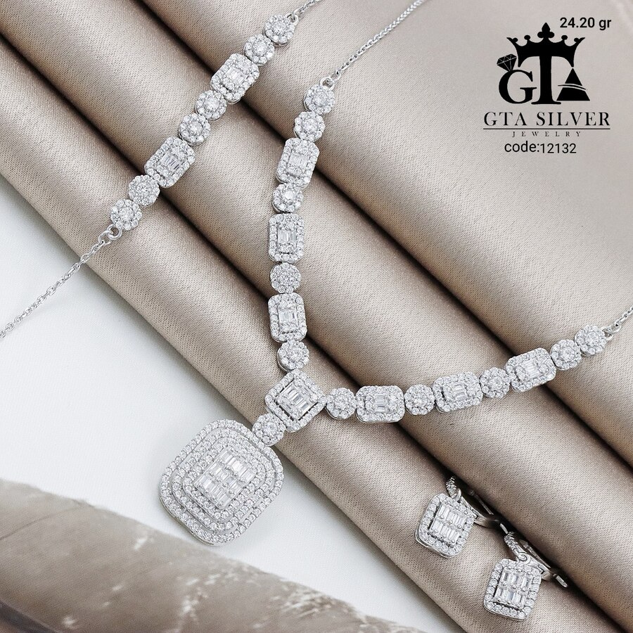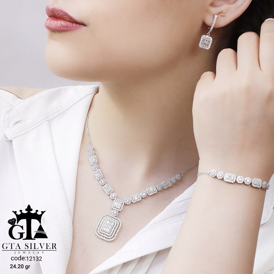 سرویس میکرو زنجیری نقره طرح امرالدکات همراه با روکش آبطلای سفید؛ عیار 925، تمامی نگین های این سرویس جدید و ظریف با روش جدید میکروستینگ مخراج کاری شده است.