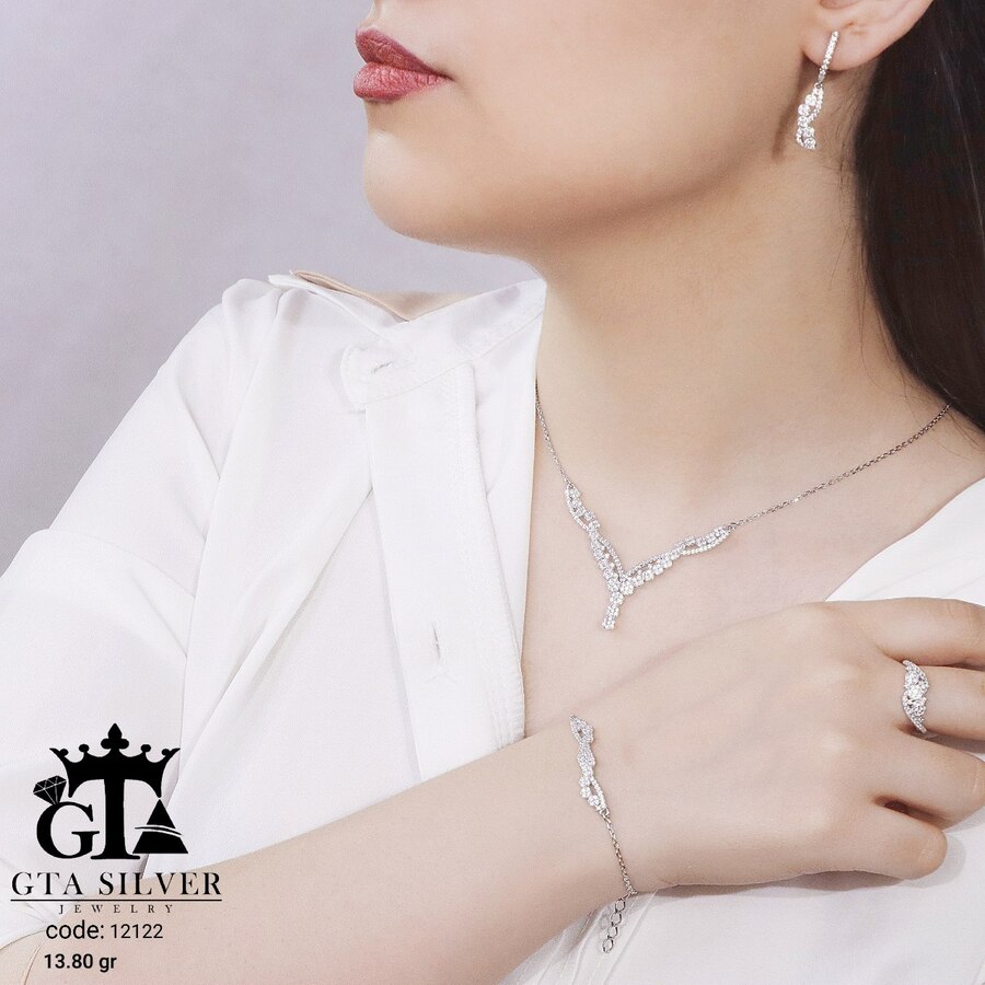 سرویس میکرو زنجیری نقره همراه با روکش آبطلای سفید؛ عیار 925، تمامی نگین های این سرویس جدید و ظریف با روش جدید میکروستینگ مخراج کاری شده است.