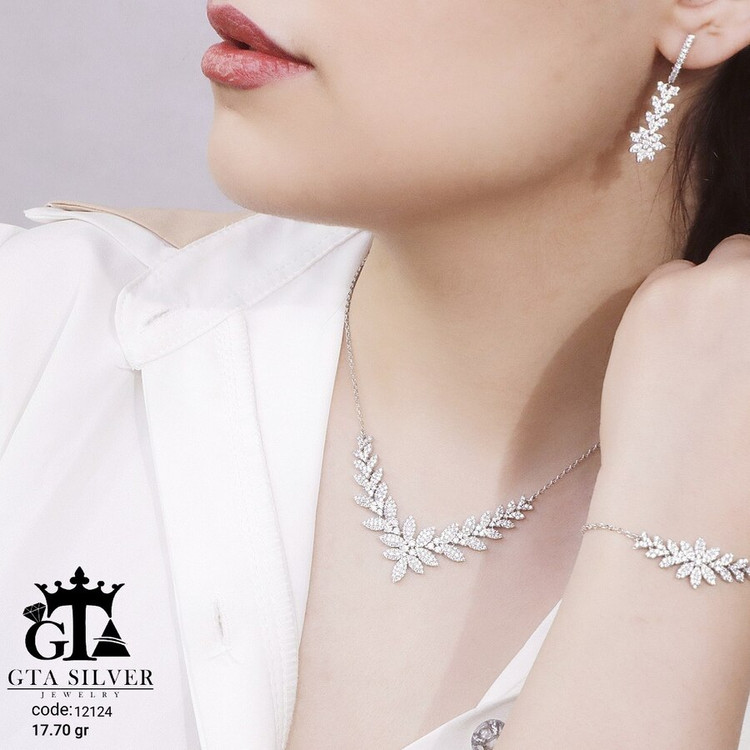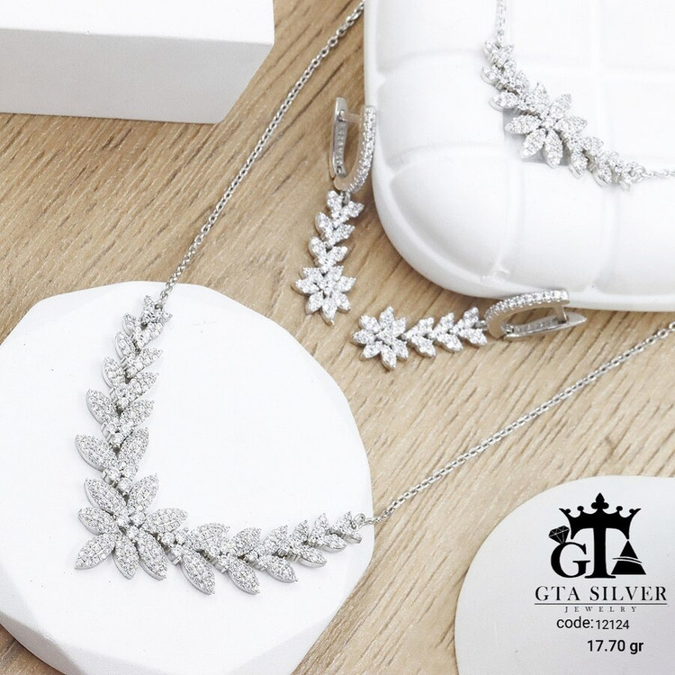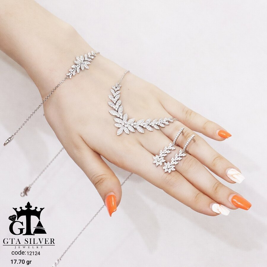 سرویس میکرو زنجیری نقره همراه با روکش آبطلای سفید؛ عیار 925، تمامی نگین های این سرویس جدید و ظریف با روش جدید میکروستینگ مخراج کاری شده است.