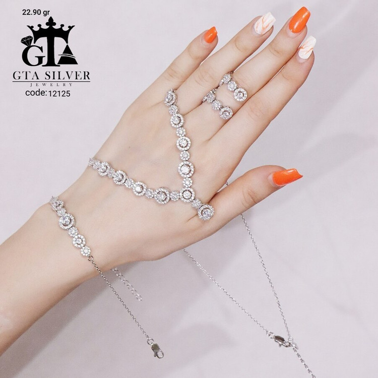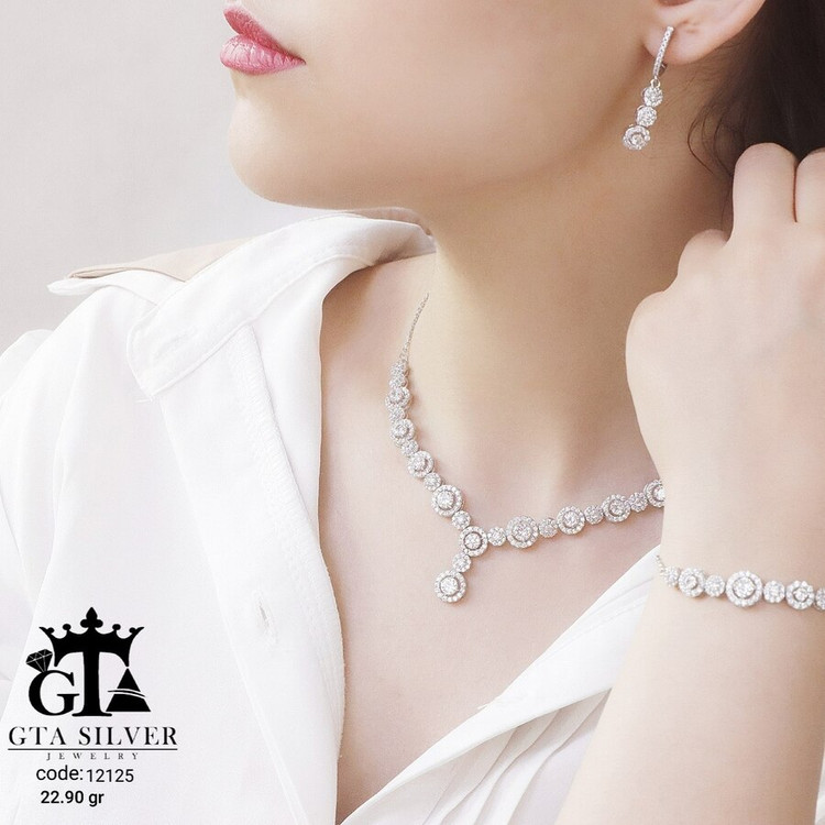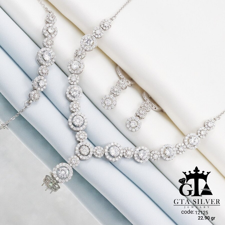 سرویس میکرو زنجیری نقره همراه با روکش آبطلای سفید؛ عیار 925، تمامی نگین های این سرویس جدید و ظریف با روش جدید میکروستینگ مخراج کاری شده است.