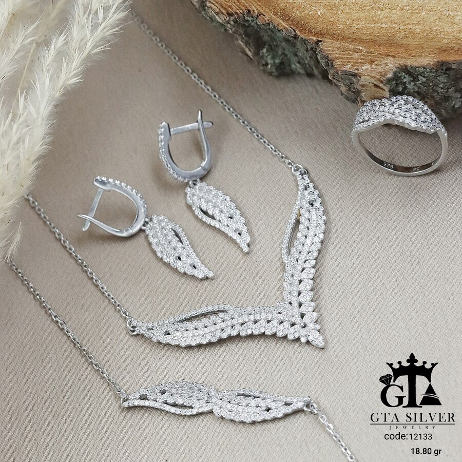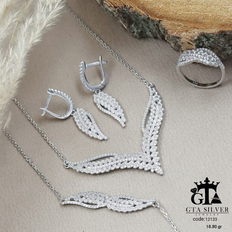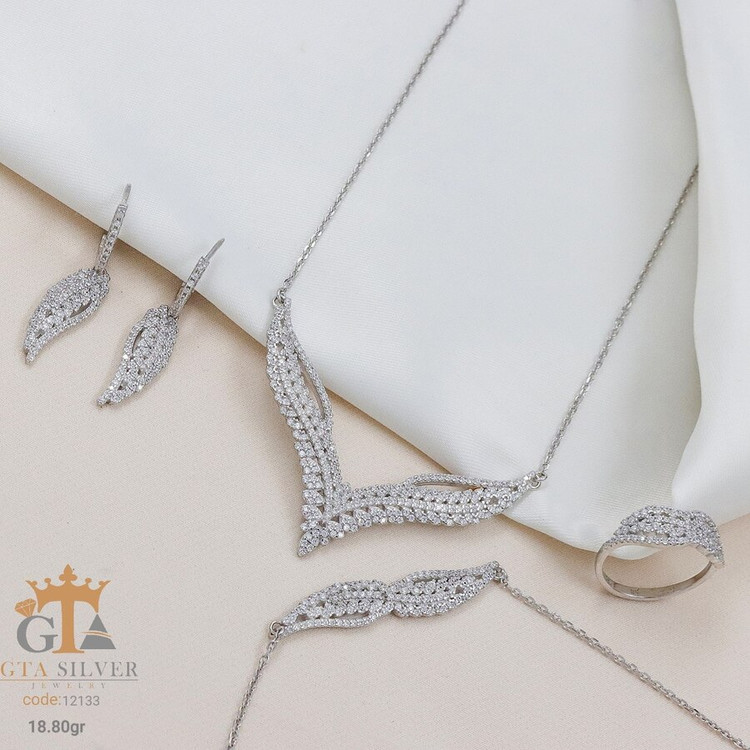 سرویس میکرو زنجیری نقره همراه با روکش آبطلای سفید؛ عیار 925، تمامی نگین های این سرویس جدید و ظریف با روش جدید میکروستینگ مخراج کاری شده است.