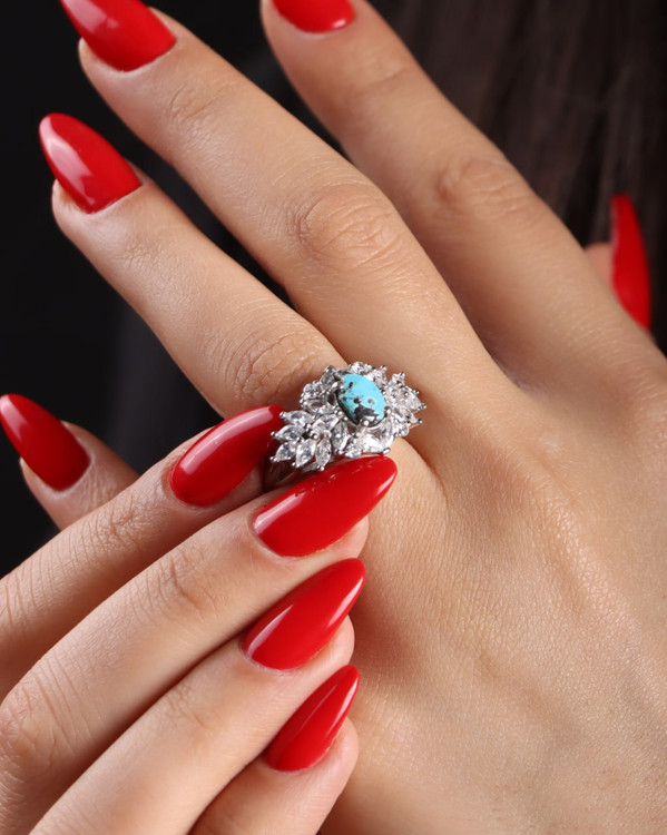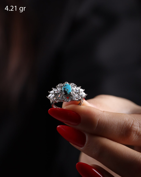 انگشترجواهری جنس نقره عیار 925 نگین مارکیز ابکاری رودیوم با سنگ فیروزه اصل