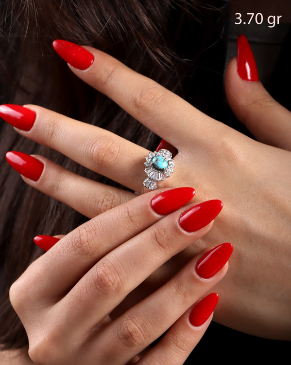 انگشترجواهری جنس نقره عیار 925 نگین مارکیز ابکاری رودیوم با سنگ فیروزه اصل